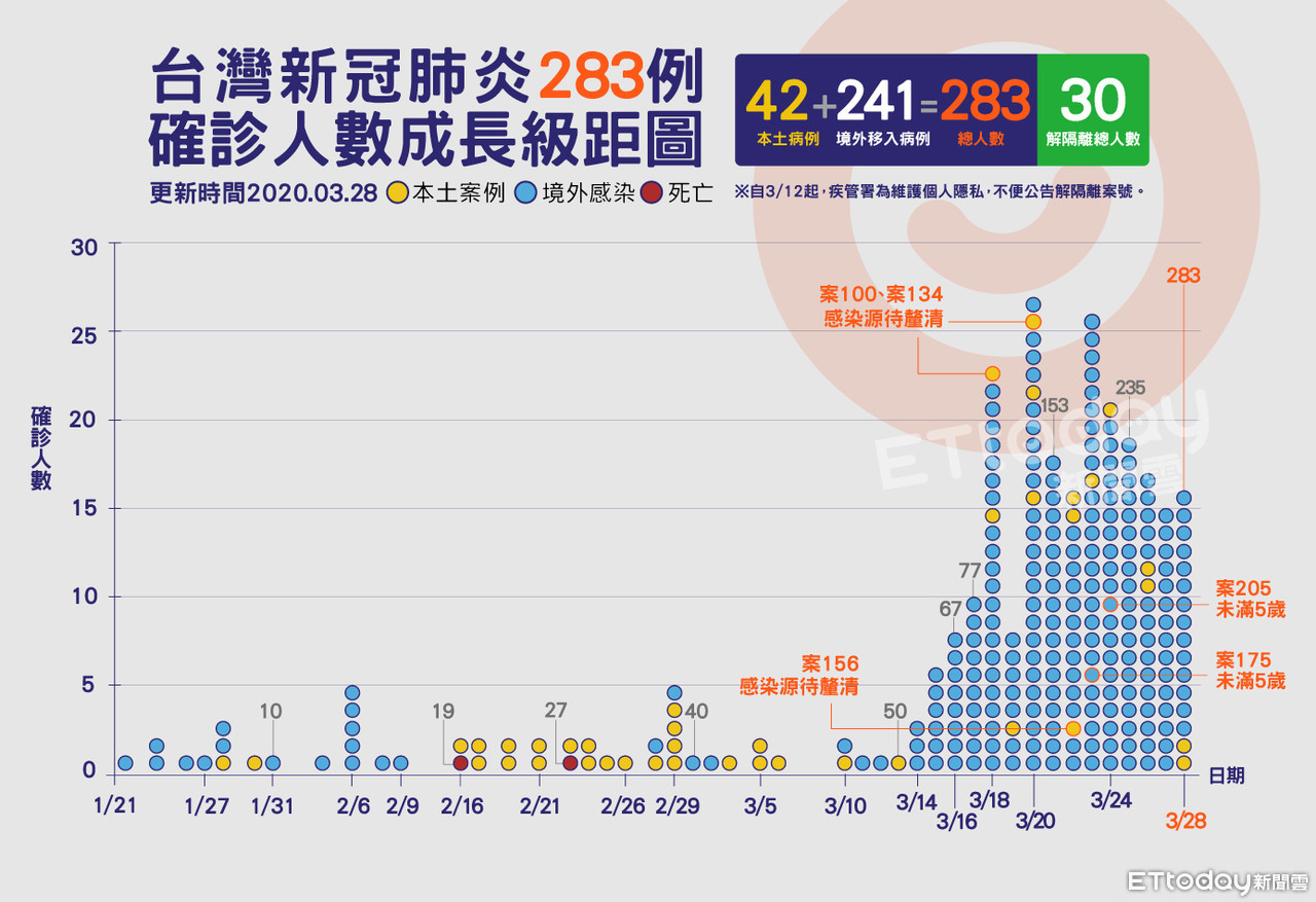 ▲國內已經確診283例新冠肺炎確定病例,其中241為境外移入,42例本土。( 圖/曾梓倩製)