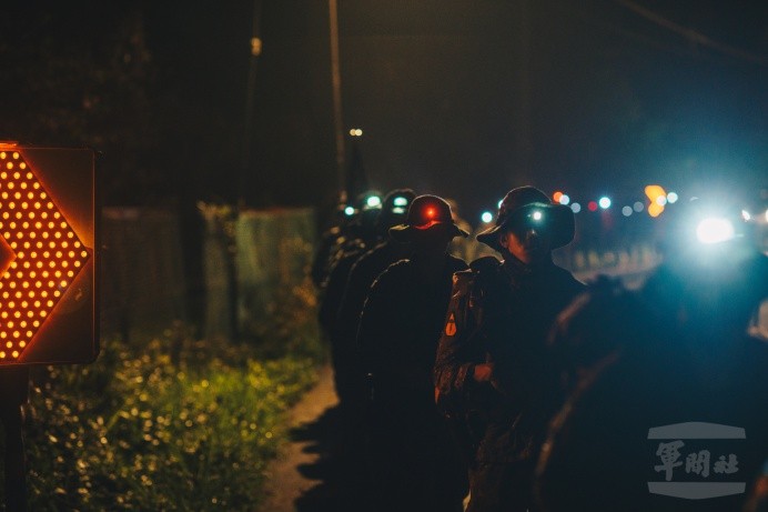 今日上午凌晨,特2營官兵完成整備後,執行夜行軍訓練,寧靜的道路上,可以看見官兵全神貫注邁步前進,展現出部隊的高昂鬥志,他們克服幾天下來的疲累,在行軍過程中驗證部隊作戰指揮、兵力運用等目標,藉由操課提升特戰部隊戰力。