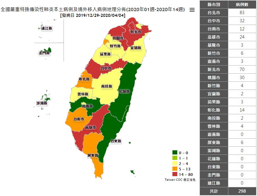 台灣新冠肺炎29日新增15例確診,包括1例本土及14例境外移入;目前共累計298例,分別為255例境外移入及43例本土。根據衛福部疾管署30日公布的確診個案地理分布圖,台北市依舊最多有83例,新北市70例、台中市32例、桃園市30例等,目前仍有6縣市維持零確診。