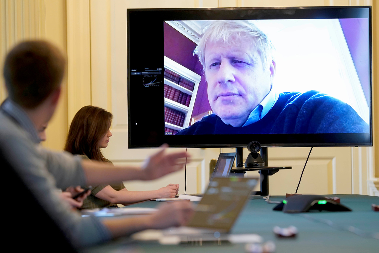 ▲ 自主隔離的英國首相強生(Boris Johnson)透過視訊參加會議。(圖/路透)