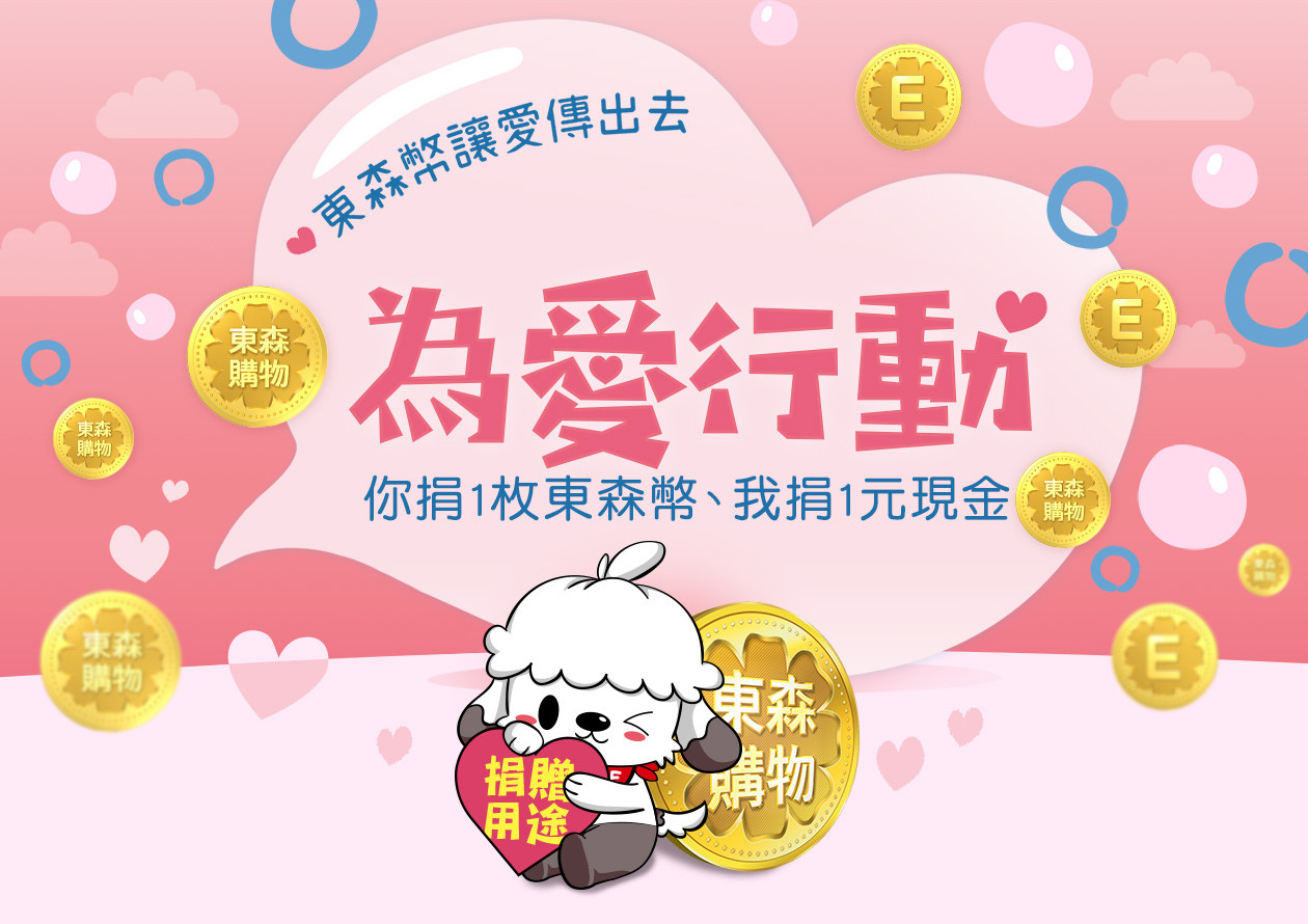 自4月起,東森購物號召全體同仁一起「為愛行動」,運用東森幣讓愛傳出去。期間只要撥打捐款專線,或透過東森購物網【東森幣公益專區】,成功捐贈1枚東森幣、東森購物就捐出1元現金加碼相挺,捐贈款項將全數捐予東森慈善基金會辦理幫助社福與弱勢團體。