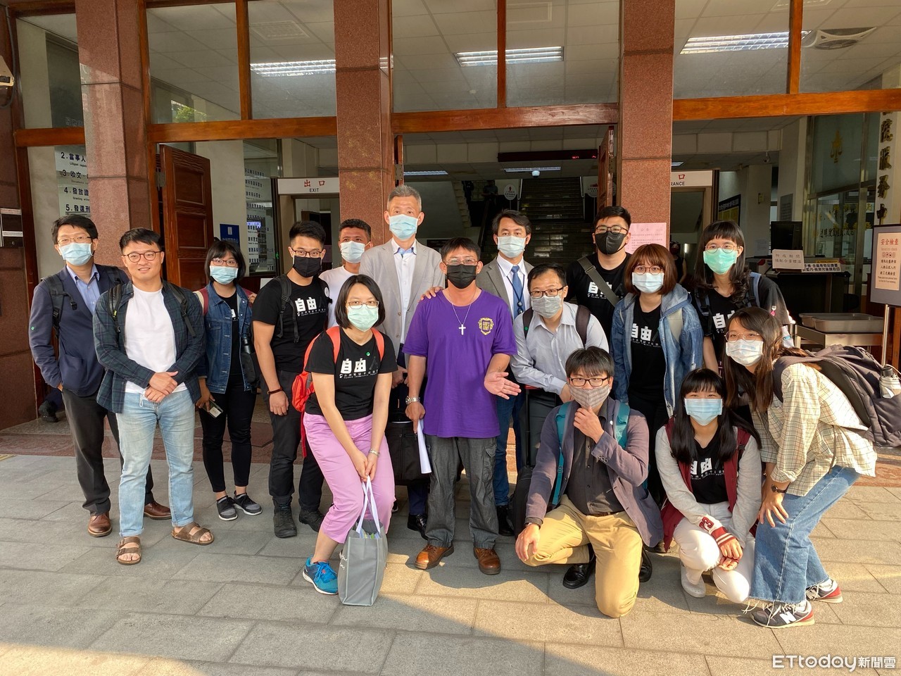 ▲謝志宏(前中穿紫衣)在律師與親友陪同下前往台南高分院出庭應訊,並堅稱他並無殺人,本案所指控均非事實。(圖/記者林悅翻攝,下同)