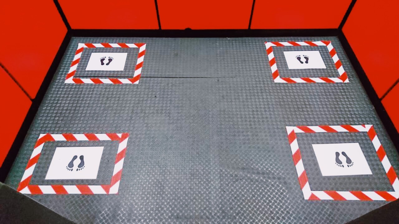 ▲華航修護工廠園區電梯以格線畫設控制使用人數,降低傳染風險。(圖/華航提供)