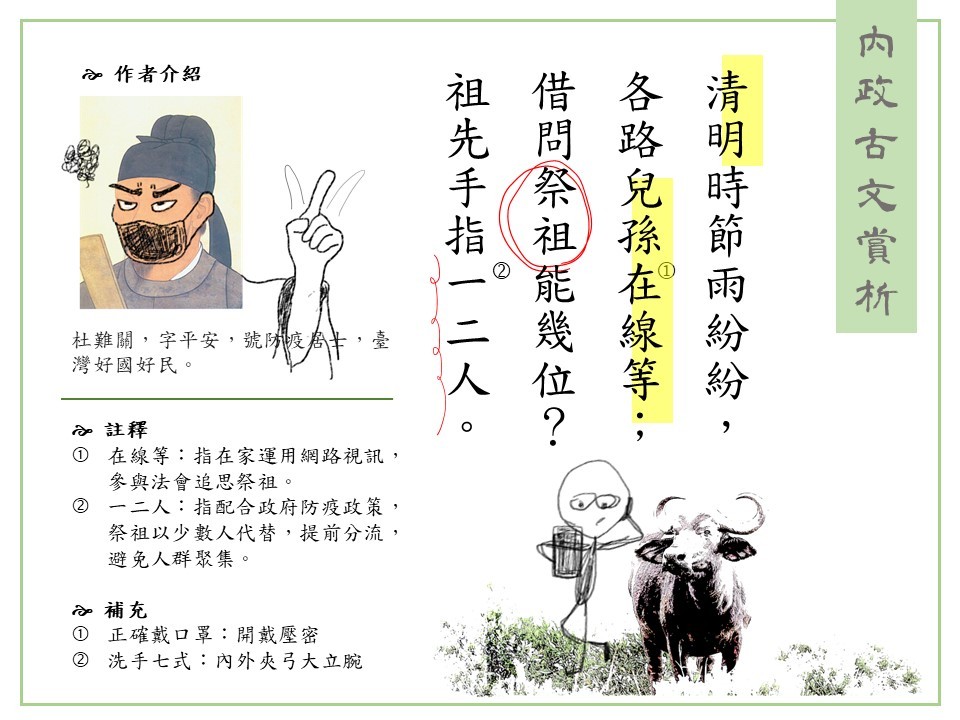內政部指出,作者為杜難關,字平安,號防疫居士,是台灣好國好民,該七言絕句為「清明時節雨紛紛,各路兒孫在線等,借問祭祖能幾位?祖先手指一二人。」