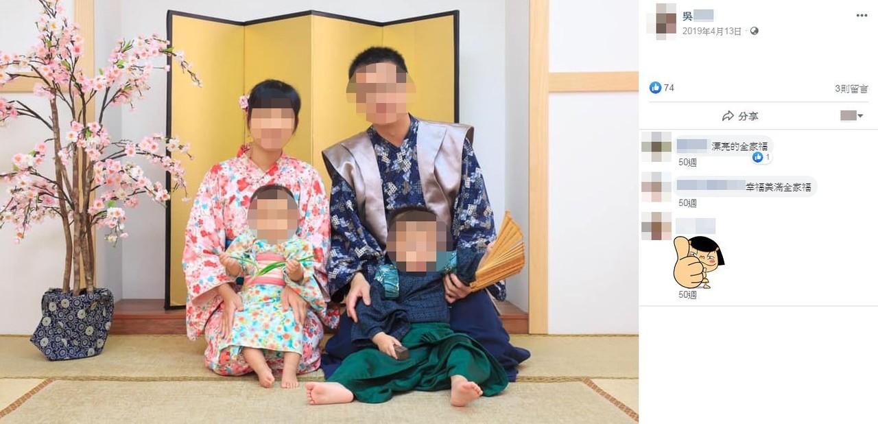 林姓丈夫得知噩耗,急忙趕去指認,看到愛妻和寶貝兒女成了3具冷冰冰的遺體,一度難過到泣不成聲。一向疼愛兒女的吳女,臉書的貼文幾乎都與家人有關,不僅經常分享孩子們的日常生活照片、影片,還會在貼文最下方註記他們的年紀,精確到連天數都有算,最後一篇PO文是3月26日,內容提到兒子、女兒當天早上還沒7點就起床玩耍,中午騎車載女兒去買午餐,沒想到孩子累到直接睡著,讓她覺得好氣又好笑。
