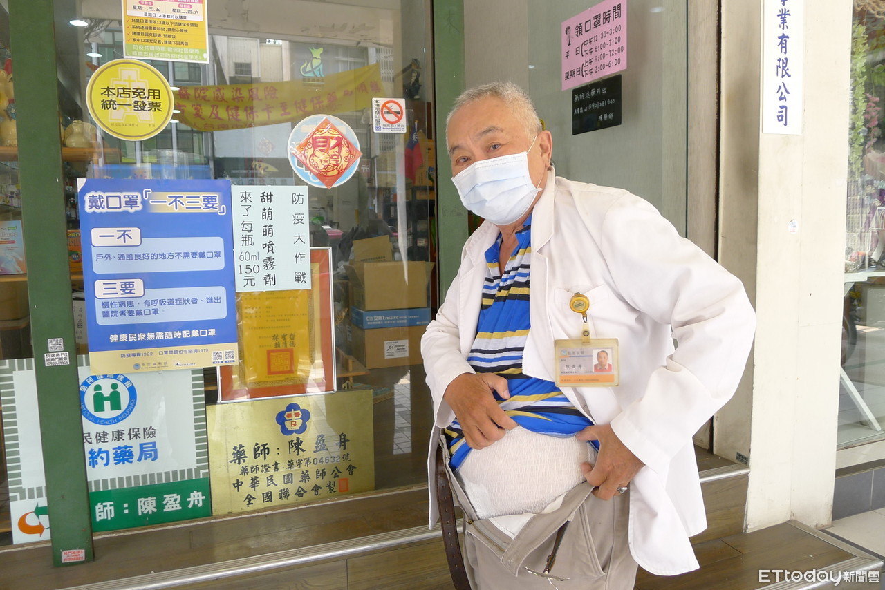 ▲台南市中西區民生路上的千代藥局72歲陳盈舟藥師,包著成人紙尿褲在服務民眾發賣口罩,其熱心盡責精神,令人感佩。(圖/記者林悅翻攝,下同)