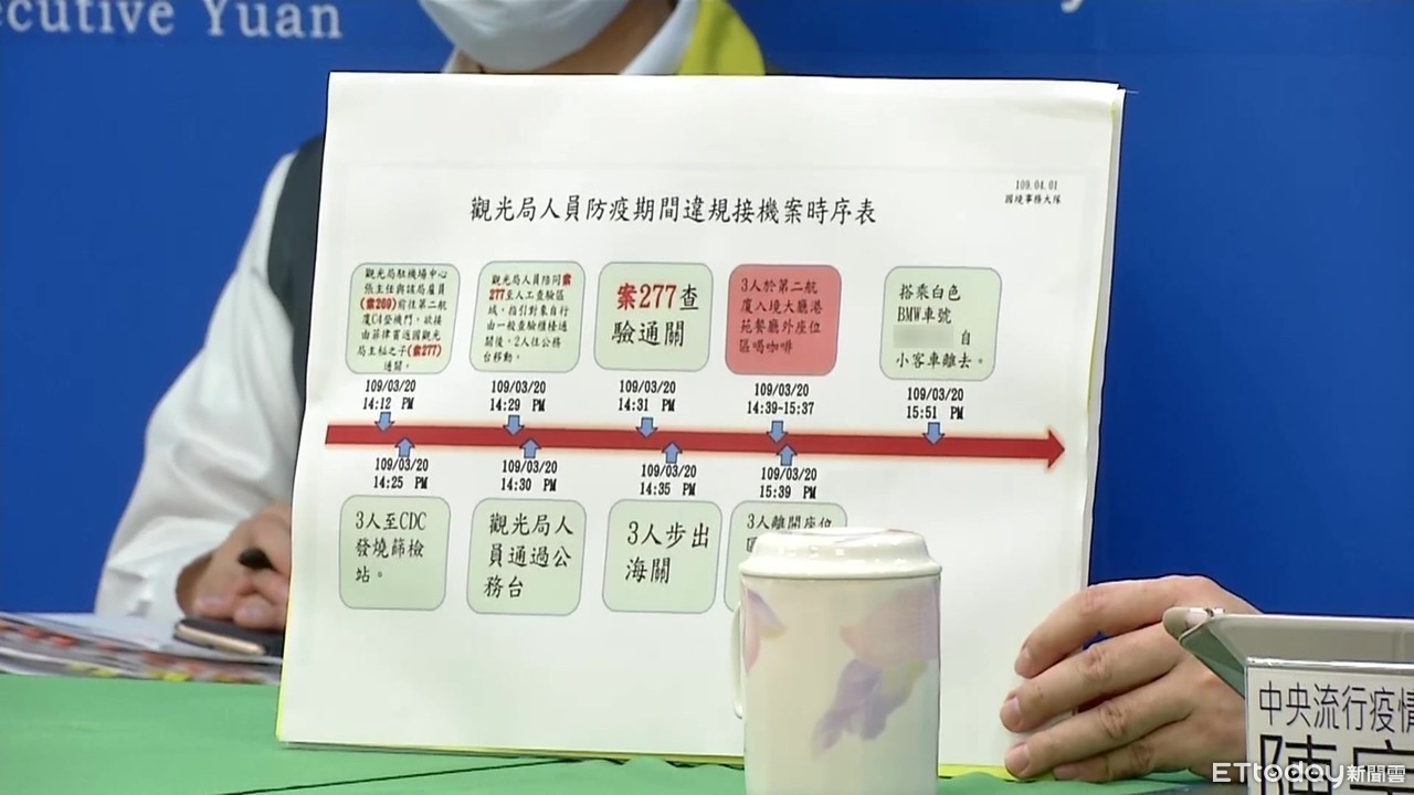 副指揮官陳宗彥說明,14時12分觀光局駐機場中心主任和受雇員(案269)在第二航廈C4登機門接從菲律賓返國的主秘之子(案277)通關,14時25分到CDC發燒篩檢站。