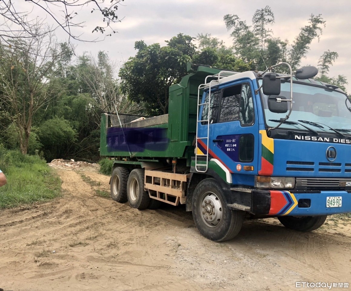 ▲台南市環警2日下午據報循線前往台南歸仁沙崙農場查獲亂倒營建剩餘土石方,當場查獲2輛某工程行卡車正載運進行棄置。(圖/記者林悅翻攝,下同)