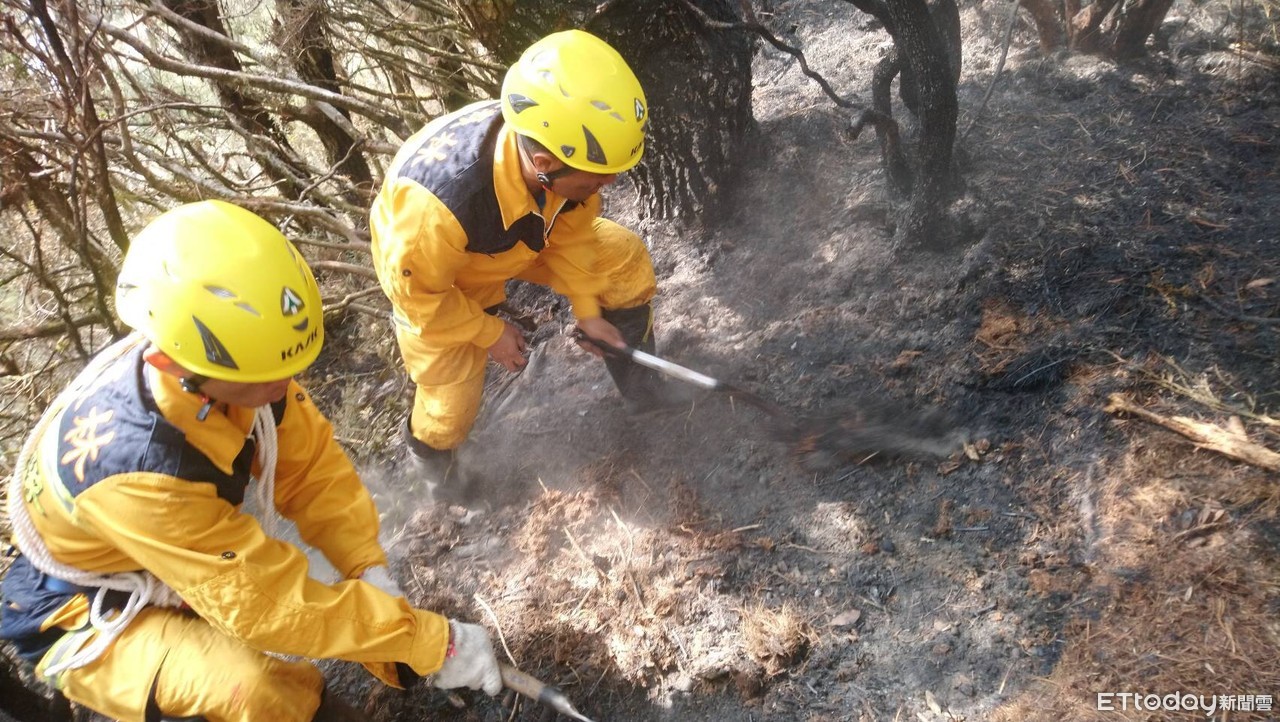 ▲護管員回報現場濕度大,其餘幾處地下火,空中灑水效果有限,需靠地面人力殘火處理。
