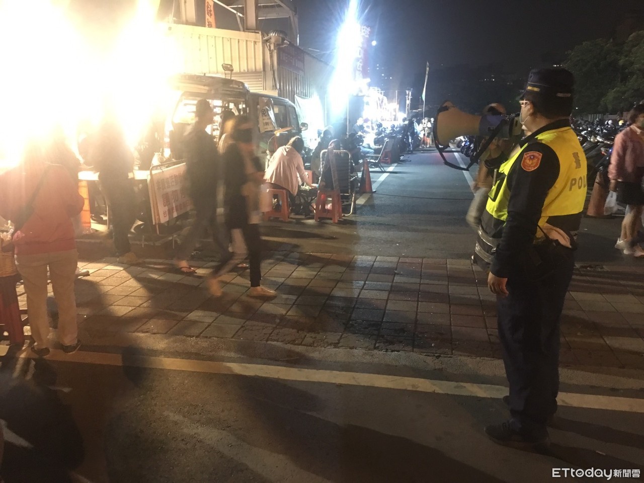 ▲台南市警一分局前往東區大東夜市,由一分局長鄭榮崑率員向民眾宣導有關「社交距離注意事項」。(圖/記者林悅翻攝,下同)