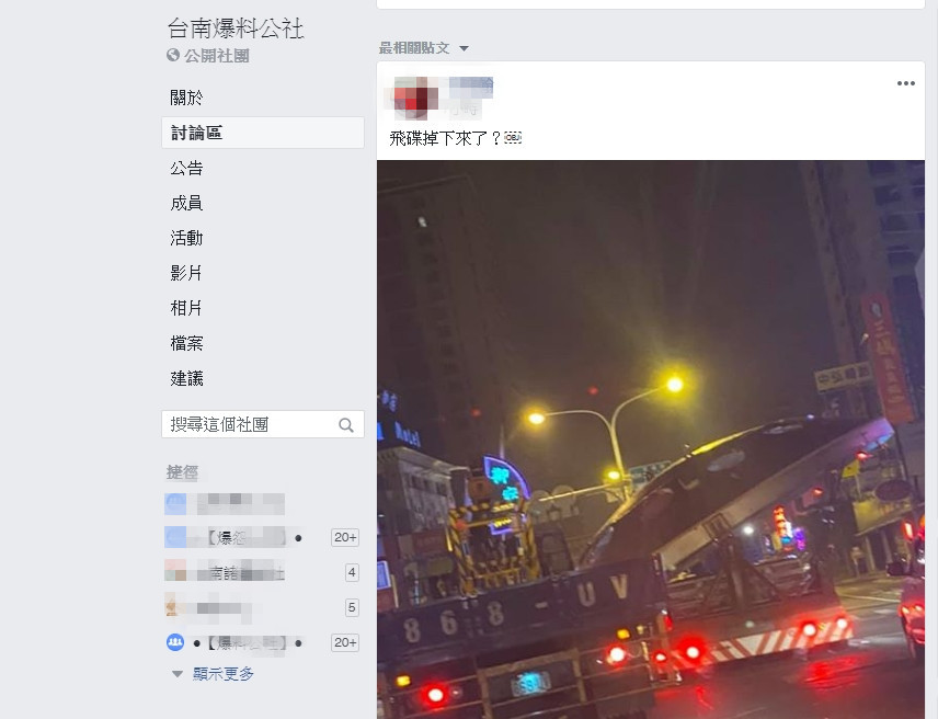 網友在6日凌晨於臉書《台南爆料公社》PO文,以「飛碟掉下來了?」為題,PO出1張照片,照片呈現1部大型聯結車,載著1個圓盤狀的大型物體,經過台南市中西區中華西路、民權路口,該物體很像大家印象中的「飛碟」,引起網友們好奇熱議,這是什麼東西?