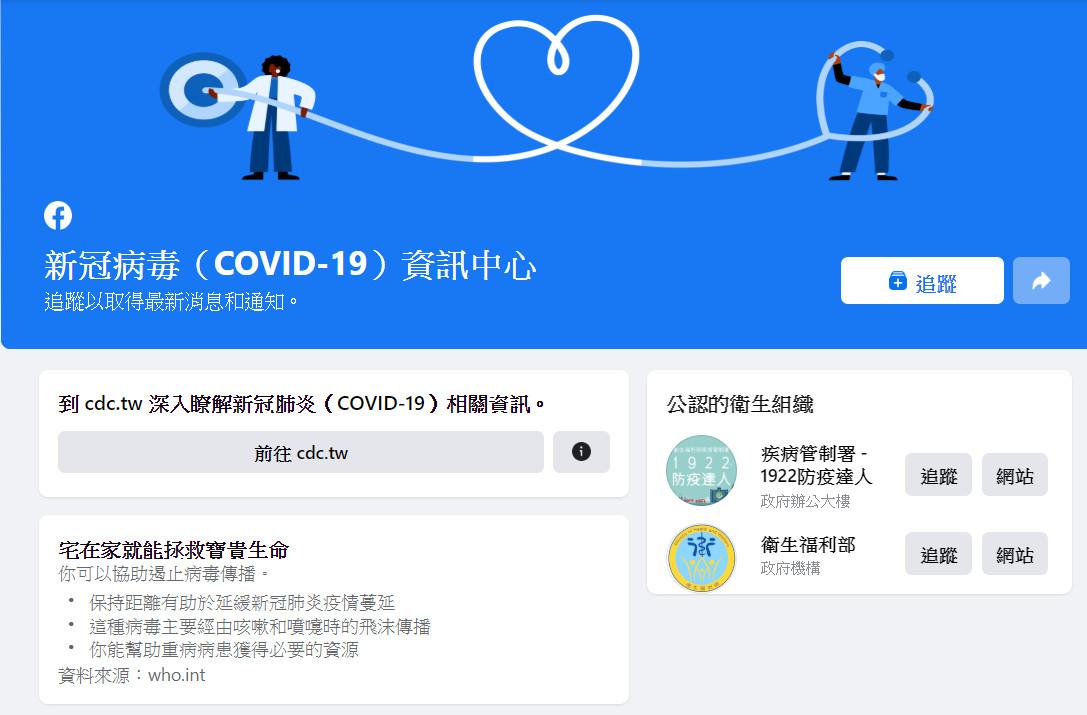 Facebook指出,新型冠狀病毒資訊中心包含全球及全國性衛生組織發布的最新COVID-19相關資訊與指南,涵蓋23種語言。即日起,新型冠狀病毒資訊中心將會包含來自台灣衛生福利部疾病管制署提供的最新資訊。