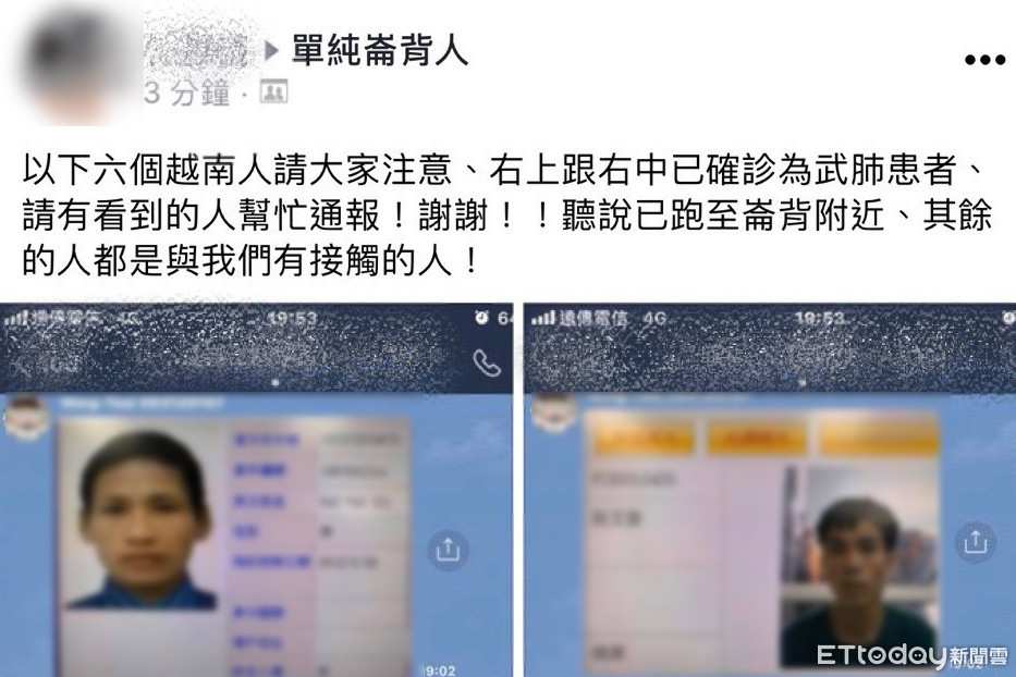 西螺分局崙背分駐所於4月1日執行網路巡邏發現臉書社團內張貼6名越籍人士照片,指稱為肺炎確診病患且出沒在崙背附近,引起民眾恐慌;西螺分局調查指出,該名女性散播謠言所張貼之外籍移工照片,為日前海巡署通報脫逃之偷渡犯,並分別於3月25日及26日已緝捕歸案,且歸案後並未出現肺炎症狀,該貼文張貼不實訊息已造成民眾恐慌。