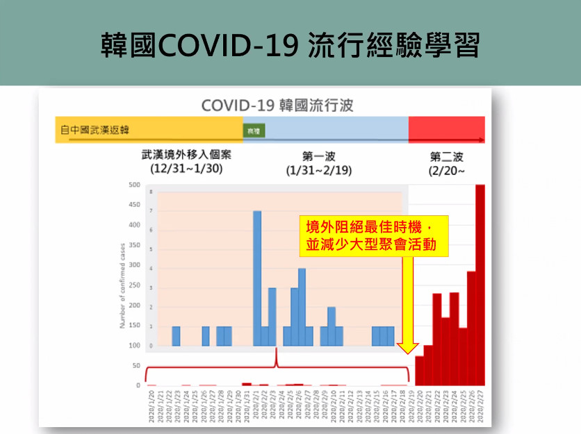 ▲韓國第一波未把握阻絕境外移入最佳時機、減災計畫不足,而爆發第二波流行。(圖/翻攝自大公共衛生學院直播)