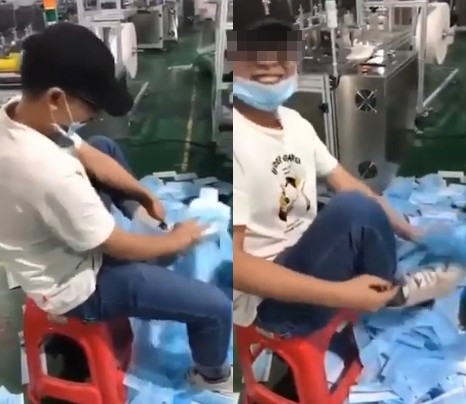 影片中可見,一名男子戴著帽子、口罩戴在下巴,沒有穿戴防塵設備,坐在疑似工廠的地方,背後全部是機械,腳下有成堆藍色口罩原料。而他手上隨便抓著一疊原料,就開始擦鞋,左邊擦完換右邊,對著鏡頭露出燦笑,一副甩帥模樣。