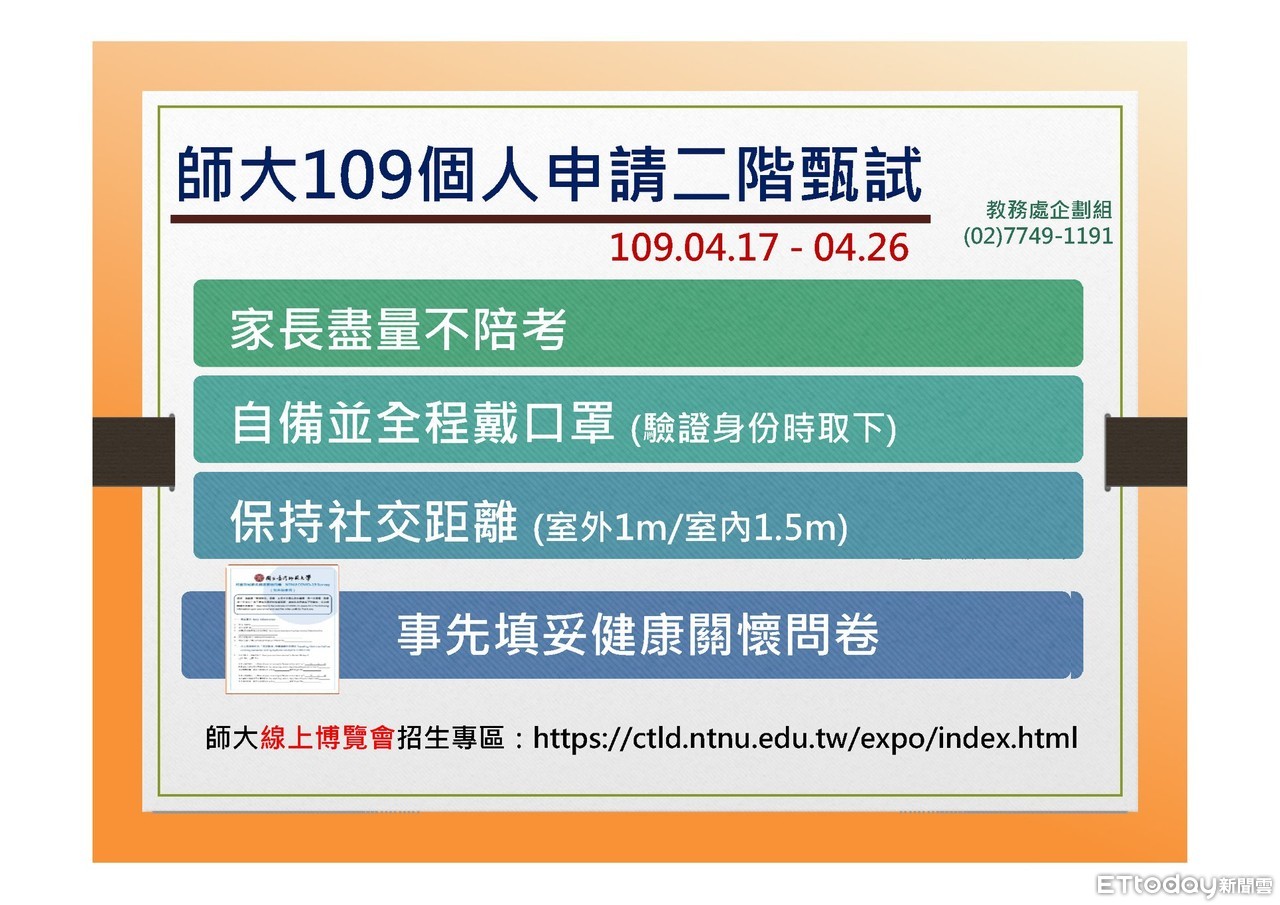 ▲台灣師範大學特別呼籲,「強烈建議」家長不陪考、考生及家長到校前需事先填寫健康關懷問卷、考生分流報到、保持社交距離、及全程戴口罩應試。(圖/台灣師範大學提供)