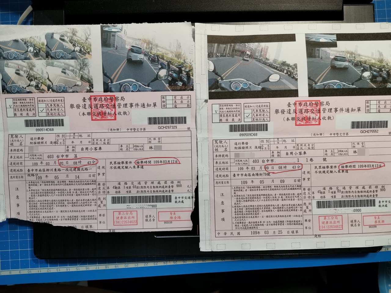 ▲台中一名林姓男駕駛收到兩張時間一樣地點相近的罰單,認為審核機制有問題,對此,警方回應了。(圖/林姓男駕駛授權提供)
