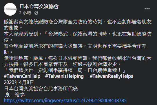 泉裕泰8日在日本台灣交流協會臉書粉專中分享蔡英文推特文章,以中文表達感謝。泉裕泰說,感謝蔡英文跟防疫台灣隊全力防疫的時刻,也不忘對鄰居老朋友的關懷。他本人深深感受到,「台灣模式」保護台灣的同時,也正在幫助國際防疫。
