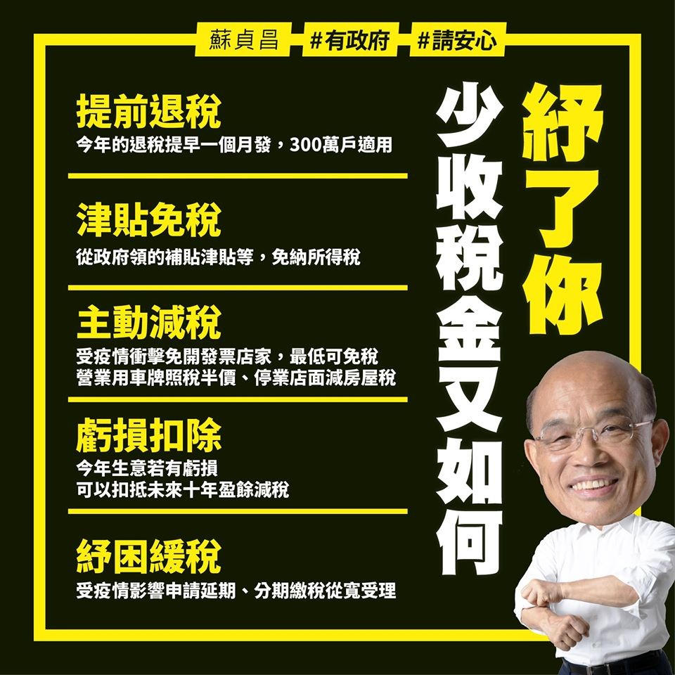 蘇貞昌透過臉書表示,不止發給弱勢現金,紓困也該少收稅金。下個月就是報稅季,對於受到疫情影響的商家、國人,減輕賦稅也能即時分擔大家的財務壓力,一起將難關撐過去,請大家幫忙把這張圖轉出去。