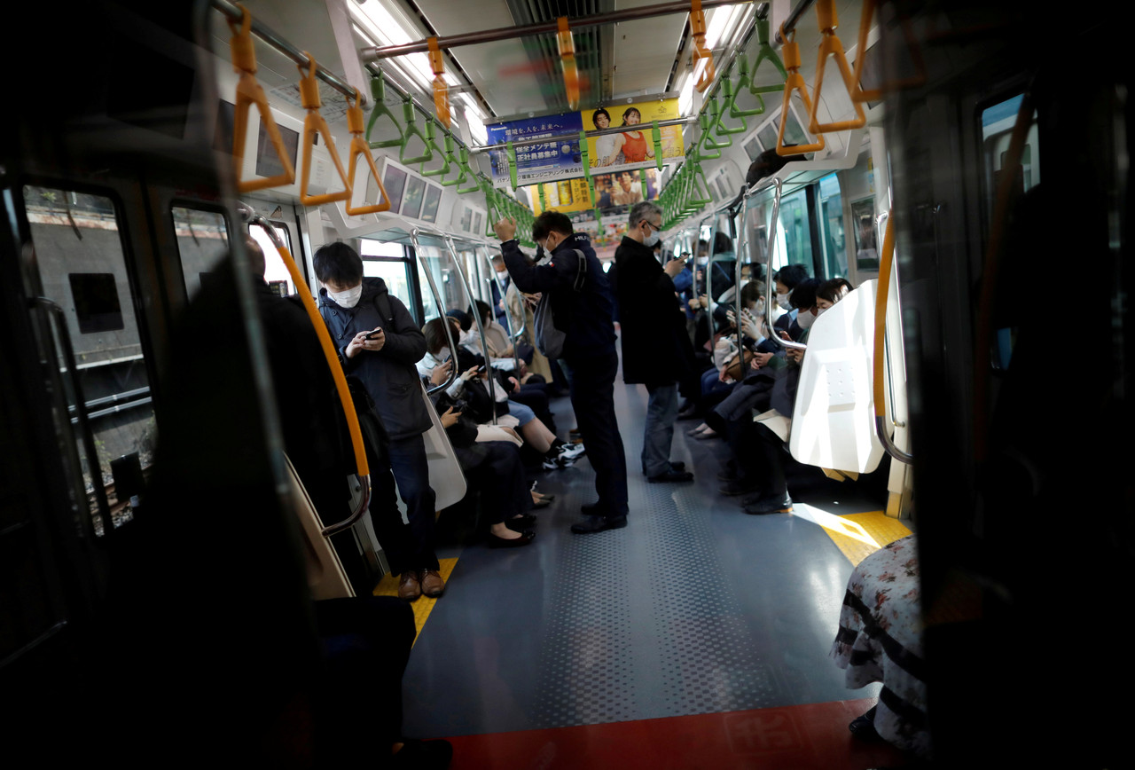▲ 東京進入緊急狀態,電車乘客紛紛戴上口罩。(圖/路透)
