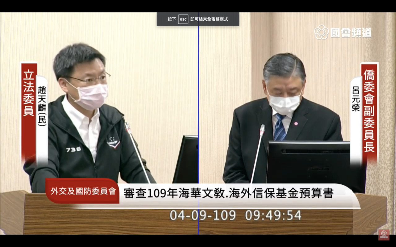 立法院外交及國防委員會9日審查僑務委員會主管「財團法人海華文教基金會」及「財團法人海外信用保證基金」109年度預算書案,並邀請呂元榮列席備詢。