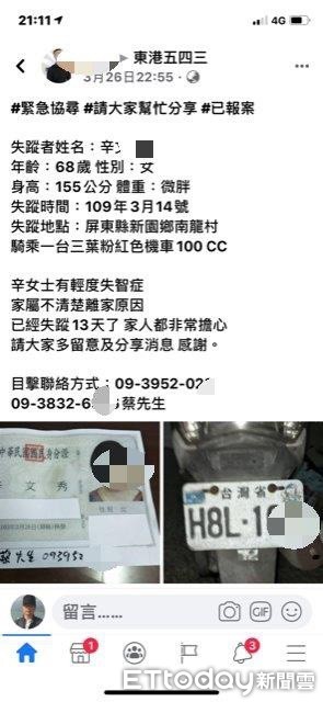 東港警分局興龍派出所於3月17日受理蔡姓男子報案指稱其母騎機車外出後失聯,警方受理後,即依規定通報分局勤務指揮中心,請各單位加強協尋;由於辛婦住家附近並無監視器,經擴大調閱附近路口監視器亦未發現其行經路線。