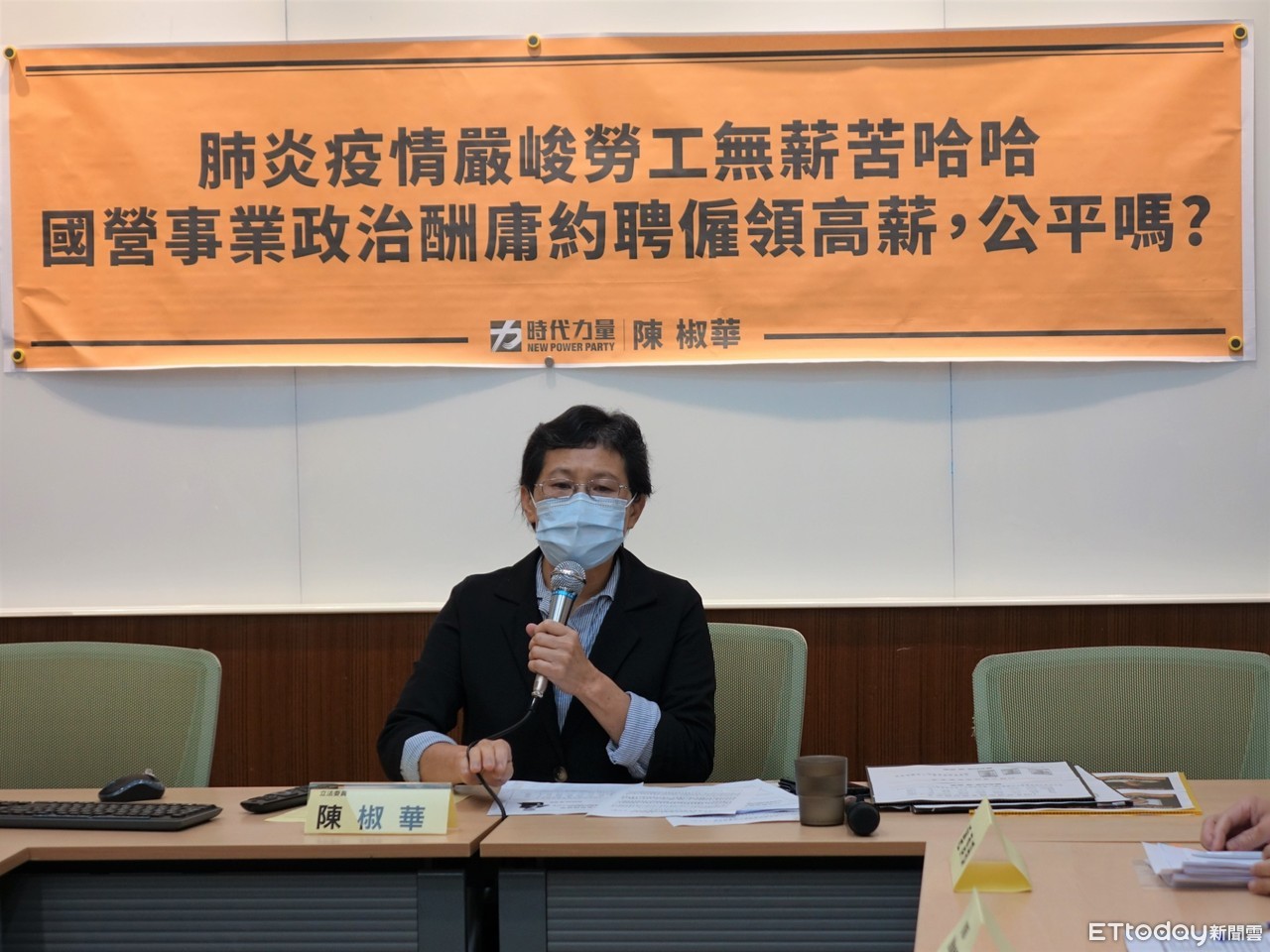 ▲時代力量立委陳椒華召開「肺炎疫情嚴峻勞工無薪苦哈哈,經濟部國營事業政治酬庸約聘僱領高薪,公平嗎?」記者會。(圖/陳椒華辦公室提供)