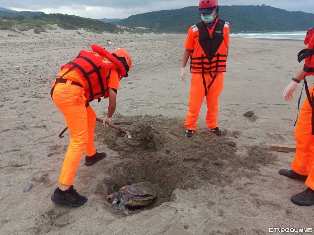 ▲海巡署南部分署第六岸巡隊第六三岸巡中隊10日下午在旭海隆岸際先後發現兩隻海龜往生,就地掩埋 。(圖/記者陳崑福翻攝)