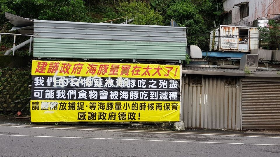 北部濱海公路新北市瑞芳區深澳漁港出現一幅巨型布條指出,建議政府海豚量實在太大了,食物鏈被海豚吃之殆盡,魚獲會被海豚吃到滅種,建議政府開放捕捉等。布條一出引發熱議,中華鯨豚協會有話要說表示,氣候變遷、過度捕撈、過度開發、人為污染才可能是減少漁業資源的元兇!不能將鯨豚當成為「洩憤的對象」以及「代罪羔羊」!