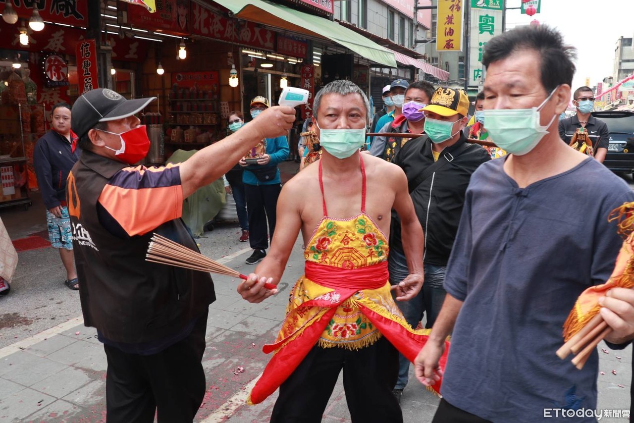 ▲朝天宮嚴加實施防疫措施,連身為神明代言人的「乩童」都不免俗須經額溫槍測量方能進入,形成有趣景象。(圖/北港朝天宮提供)