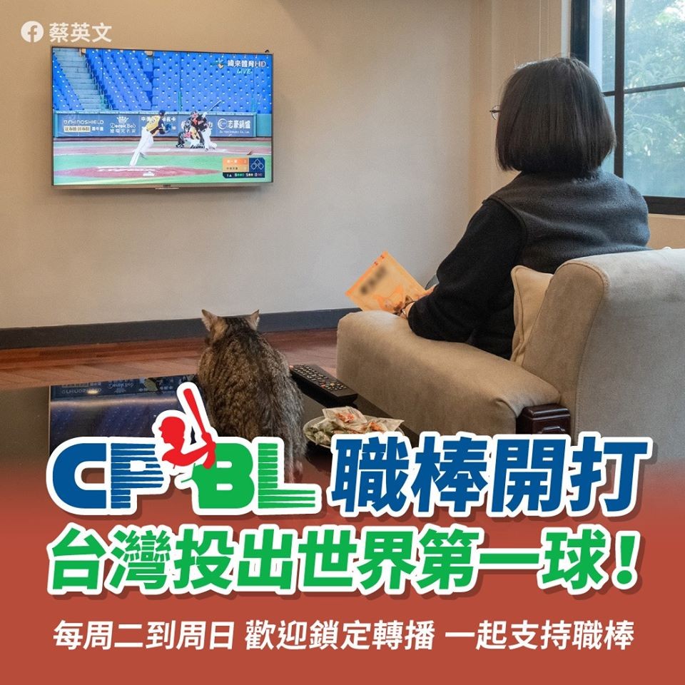 中信兄弟12日在洲際主場迎戰統一獅,是全球第一場開打的職棒賽事,蔡英文與愛貓「蔡想想」守在電視機前收看轉播,更俏皮的在臉書問大家,「你也收看轉播了嗎?」也替中職宣傳,接下來每周二到周日,歡迎鎖定轉播,一起支持台灣棒球!更重要的是,「等疫情結束後,我們相約在球場見喔!」