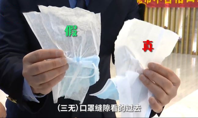 影片中,工作人員把黑心口罩剪開發現,濾芯使用的布極其薄,甚至近乎透明。此外,黑心口罩的滲水情況也非常嚴重,相比之下,合規的口罩幾乎不滲水。
