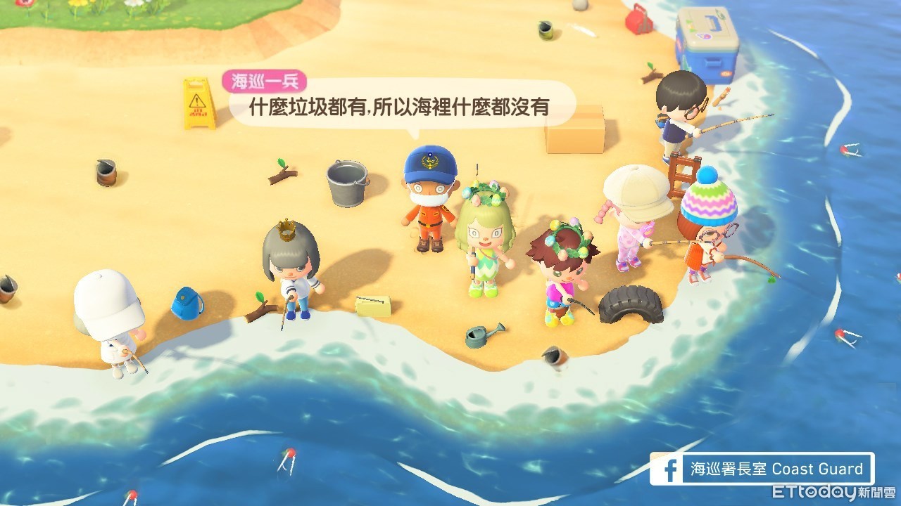 海巡署搭上近來最火紅夯game《動物森友會》風潮,13日中午透過海巡署長室CGA臉書粉絲專頁推出海洋資源保育宣導;署長陳國恩語重心長表示「如果有一天,你的島上再也釣不到魚」,配上動物森友會遊戲畫面,一名「海巡一兵」站在海邊呼籲:「甚麼垃圾都有,所以海裡甚麼都沒有…」,呼籲遊客到海邊遊憩千萬別亂丟垃圾、保護海洋環境。