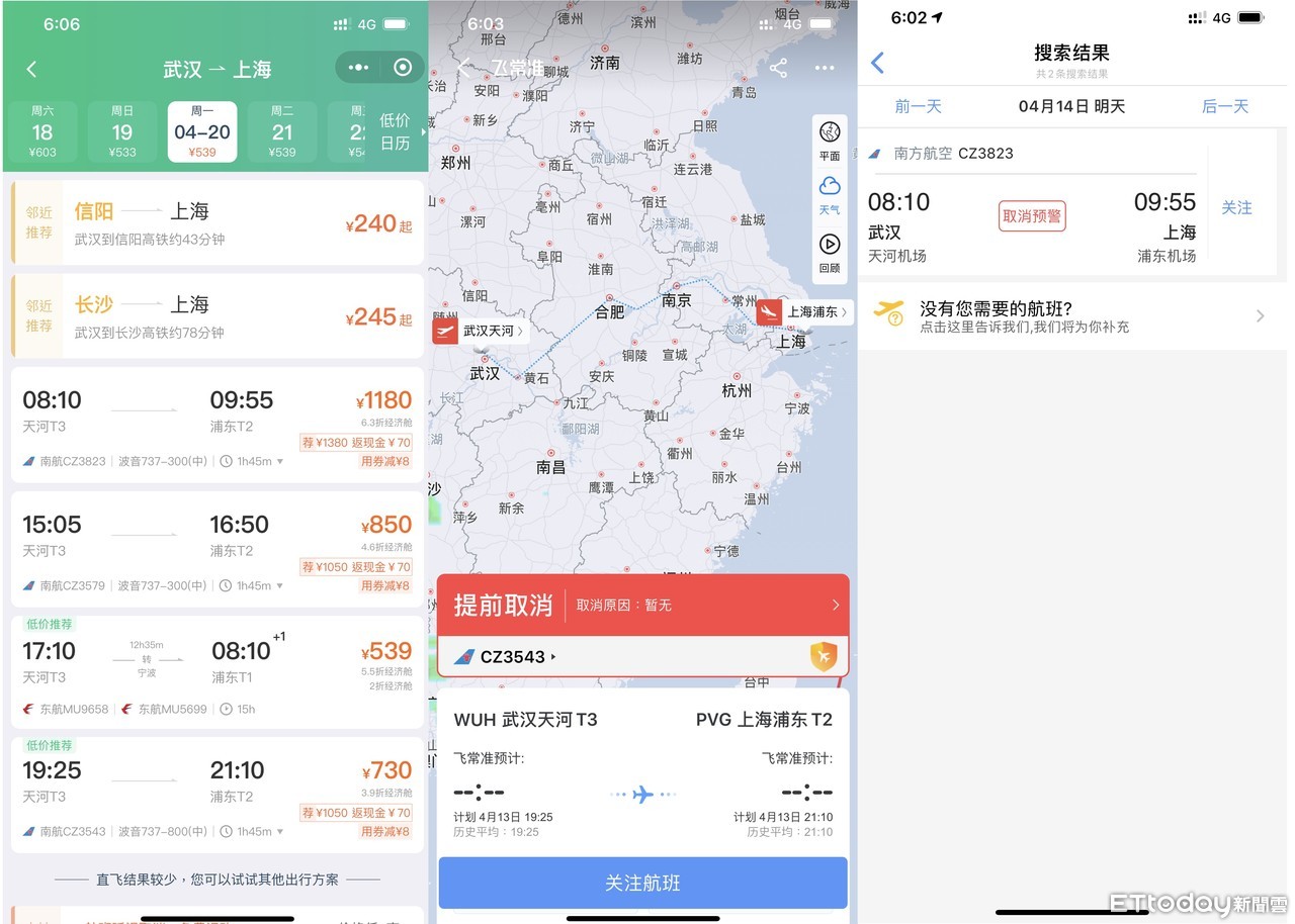 據瞭解,武漢8日解除通道管制後,民眾憑健康碼「綠碼」即可出城,當日大陸官媒亦積極報導民眾搭乘飛機、高鐵復崗、返鄉過程。但經實際查詢,目前從武漢天河機場,直飛上海浦東的一天2到3架次航班中,多數這幾日都被「提前取消」,日後的班次也多有備註「取消預警。」