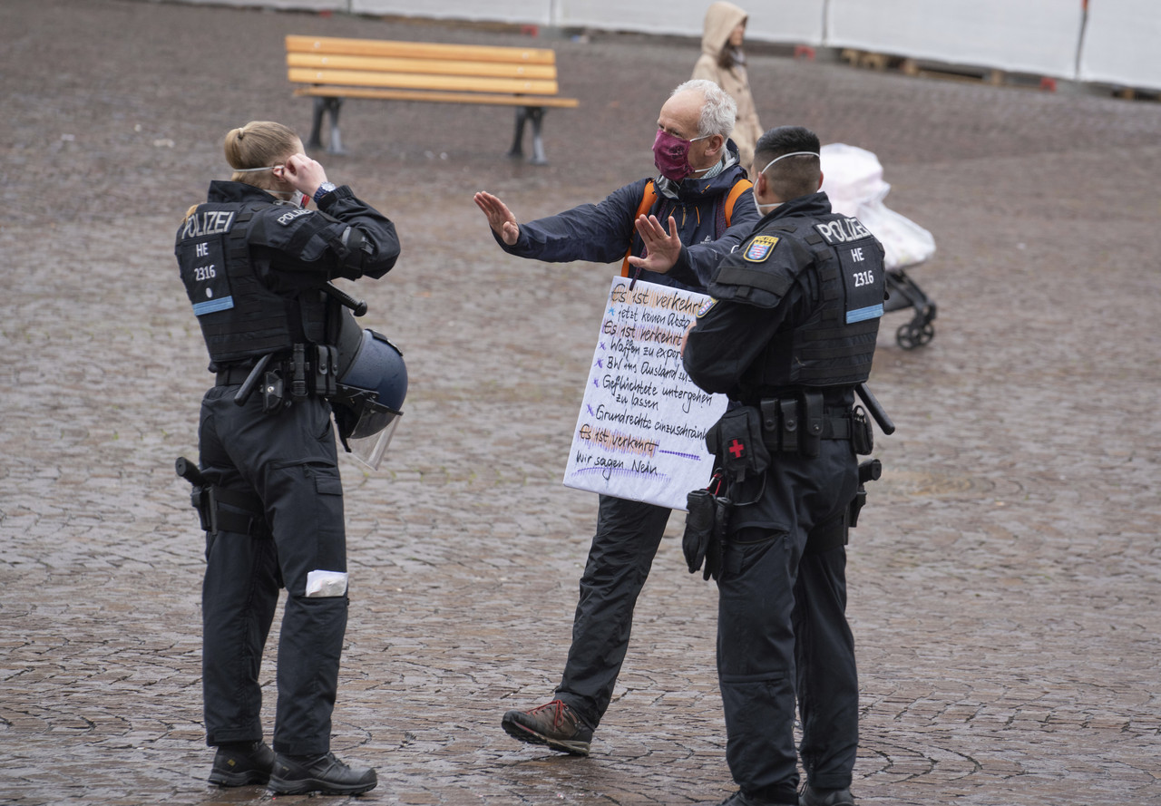 ▲德國警察勸導抗議民眾離開廣場。(圖/路透)