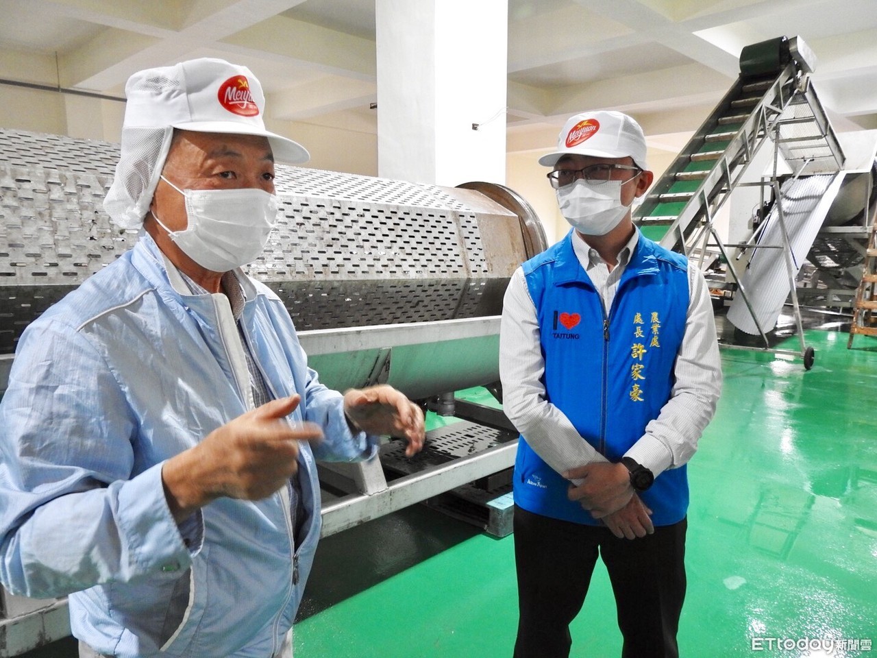 ▲台東青梅不受新冠肺炎影響契作價格更勝往年,台東縣府農業處長許家豪前往卑南鄉賓朗村的美元蜜餞食品新建廠房區視察,特感謝林東隆董事長投資台東。(圖/記者楊鈞典翻攝,下同)