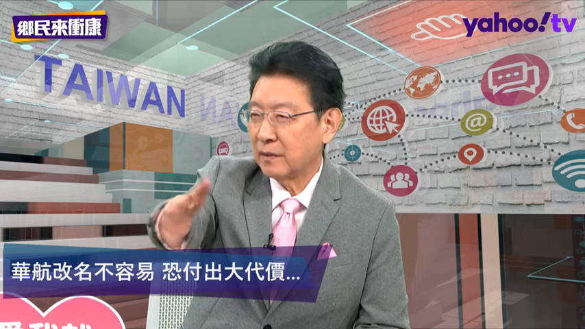 趙少康點出,「錢還小事,主要是航權」,對民進黨來說錢還是小事,「我們現在國名叫什麼?叫中華民國嗎?把這名字改掉嘛,先把名字改掉再說嘛,你國名叫中華民國,為什麼要飛機改名呢?不管怎樣,不要只改飛機的名字,而且我也不懂,中華航空應該是早於中國民航,「為什麼要我改不是他改呢?」
