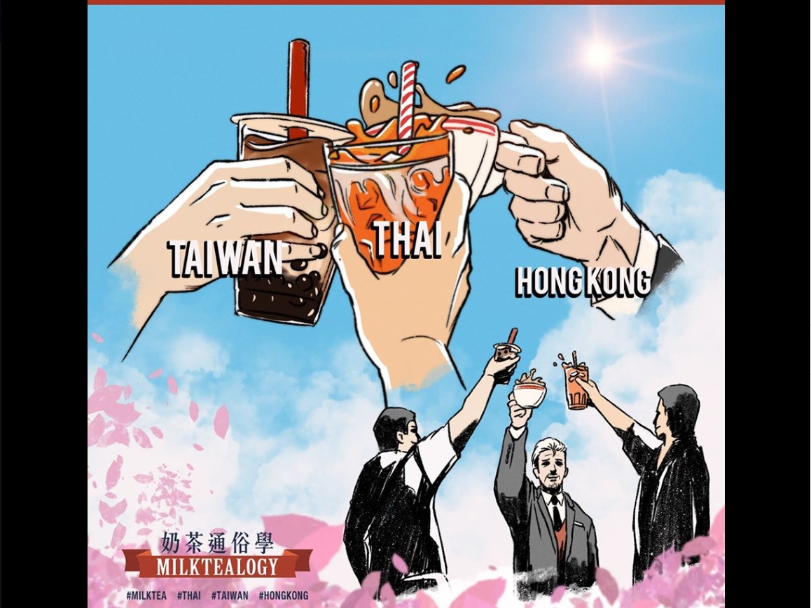 「奶茶通俗學 Milktealogy」14日發布的一張圖片,裡面分別以台灣的珍珠奶茶、泰國的泰式奶茶以及香港的絲襪奶茶,三個人一起高舉奶茶乾杯,以最草根、最在地的國民飲料,代表三方網友的團結與友好。