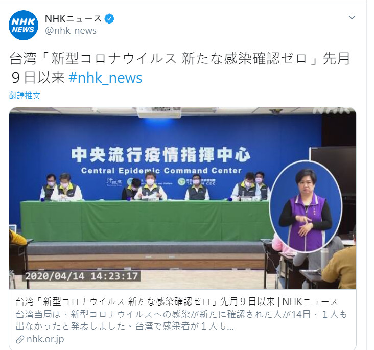 中央流行疫情指揮中心指出,14日無新增確診病例,睽違36天台灣終於0確診,好消息振奮人心,日本放送協會(NHK)也以「台灣『新冠肺炎零確診』」報導,提及自3月9日後超過一月,台灣官員宣布14日0確診病例,底下湧入大票網友以日文回應,大讚「台灣疫情已受到控制,日本應該仿效」、「台灣很棒!」