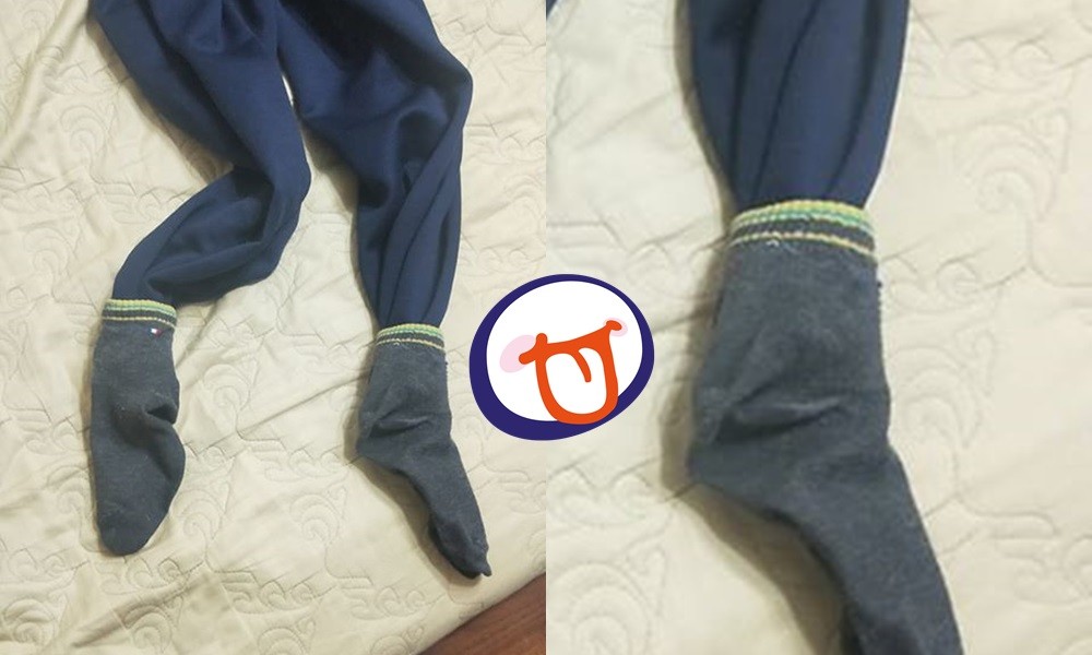 就有人認為「我覺得那是脫掉之後再特地套上去的啦!」原PO馬上掛保證「沒有,真的長這樣~我親手提起來,還怕襪子掉下來,輕手輕腳擺好姿勢放床上拍照的……」還有人猜「我懂,這孩子一定趕著要去玩什麼,哈哈!」原PO就解答「可惡~妳居然懂! 就是手機!」