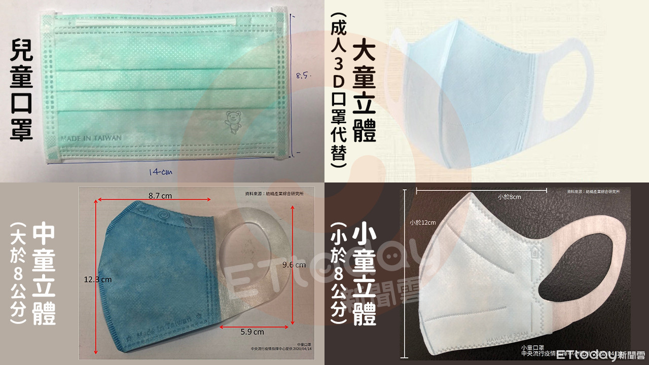 ▲兒童口罩分成以下4種尺寸「兒童、大童、中童和小童」。(圖/指揮中心提供)