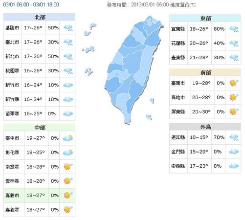 另外,中央氣象局表示,1日白天台灣各地及澎湖、金門大多為多雲到晴的天氣,僅東半部地區及馬祖有局部短暫雨;晚起鋒面影響,北部、東半部地區及金門將轉為有短暫雨的天氣,其他地區雲量增多。