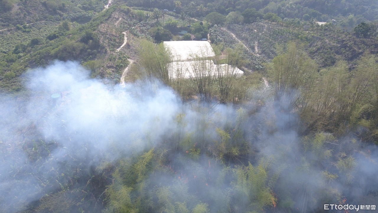 台南市左鎮區及玉井區交界中正里,15日下午發生山林火警,台南市119救災救護指揮中心隨即派遣人車前往搶救,因起火在半山腰火勢及燃燒面積很大,消防車上不去,消防局出動空拍機協助定位,申請直升機吊掛水袋滅火。