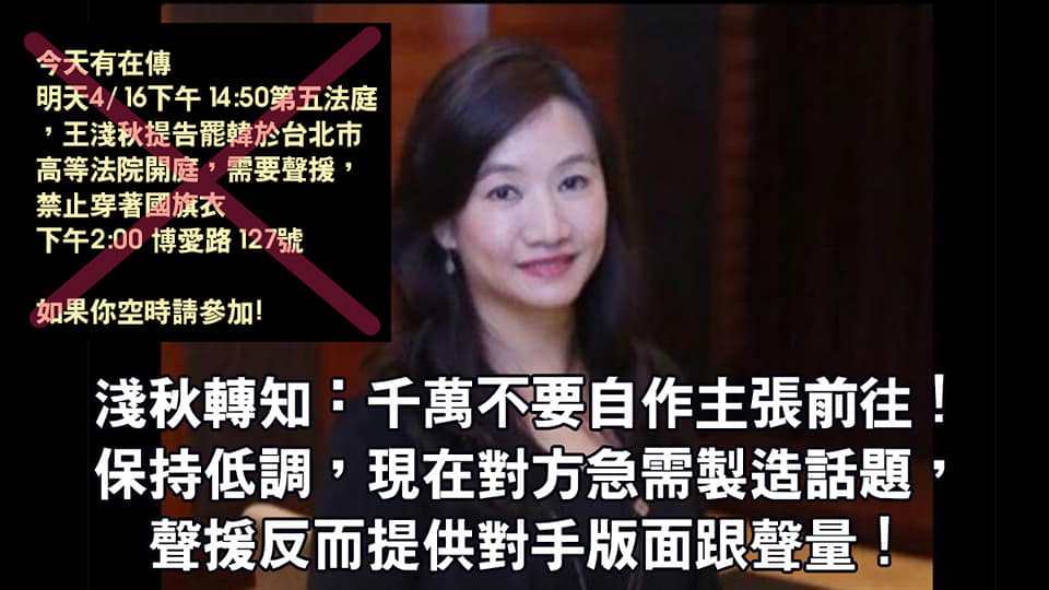 不過鋼鐵韓粉杏仁哥在臉書分享:「有消息傳出有人號召在王淺秋至高等法院開庭時需要聲援,禁止穿著國旗裝」;不過經王淺秋轉知消息,千萬不要自作主張前往,保持低調,現在對方急需製造話題,聲援反而提供對手版面跟聲量,更強調這是公廁(意指Wecare)在製造話題衝突,切記勿上當前往。