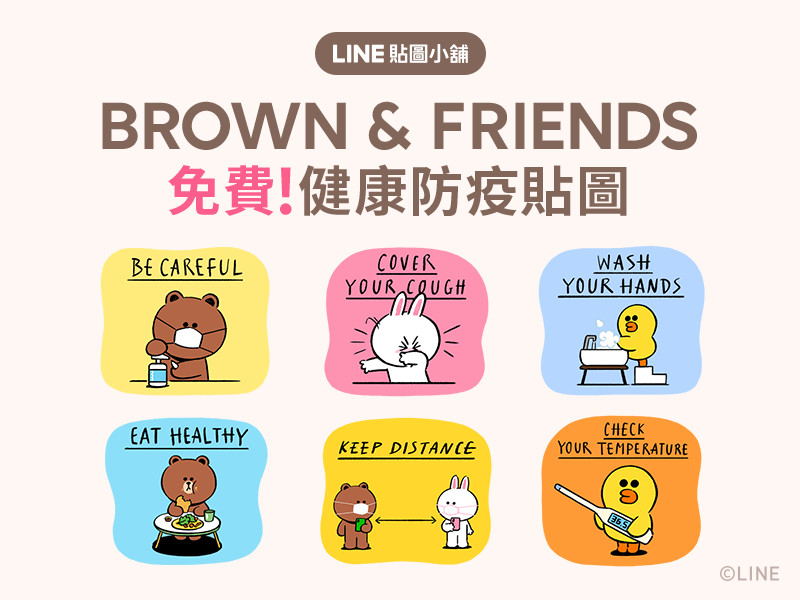 防疫時期,人人有責,LINE這次推出的「熊大健康防疫貼圖」,屬於全球通用的英文版,但是圖片簡單明瞭,有熊大戴口罩的要小心、兔兔咳嗽摀住口鼻、莎莉洗手、熊大和兔兔保持社交距離、熊大做運動、熊大吃得健康、莎莉量體溫、兔兔待在家的超可愛8款貼圖。
