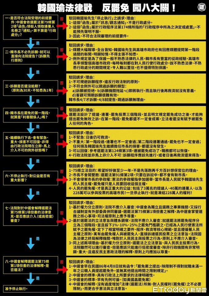 韓營聲請停止罷韓案,於16日下午2時30分在台北高等行政法院首度開庭,即將展開一場挺韓與罷韓的法律戰!而罷韓委任律師高榮志,已準備好8大理由應戰。