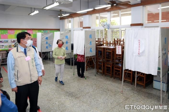 ▲台南市玉井區玉田里及安南區溪東里里長補選,市長黃偉哲與選舉委員會主委方進呈,一同至海佃國小投票所巡視投票情形與防疫工作。(圖/記者林悅翻攝,下同)