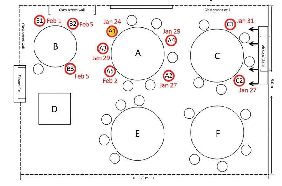 患者A1與其他桌的距離都超過1公尺,研究者推論,病毒可能是透過飛沫傳播,在空調的強勁氣流下飛得更遠,超過了一般的1公尺遠,而關鍵因素則是氣流的方向。研究建議,應該增加桌子間的距離,並加強通風。