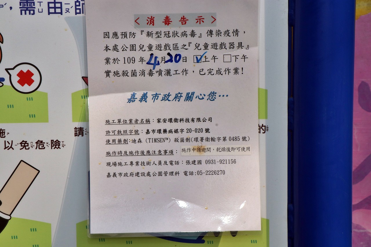 陳光興表示,嘉義公園就有三座遊具,像是大象溜滑梯、太空城堡及孔廟附近的童玩廣場,樣樣都是小朋友喜愛的兒童遊戲場。為了讓消毒工作更加到位,市府委請廠商使用背載式動力噴霧機,同時使用具安定性、不揮發、不可燃的迪森殺菌劑來進行消毒,此殺菌劑通過美國抑菌實驗可消滅流感病毒、有效殺死細菌及抑制99.9%病毒。