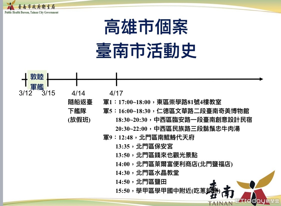 ▲台南市衛生局公布高雄市新冠肺炎確診個案台南活動史。(圖/記者林悅翻攝)